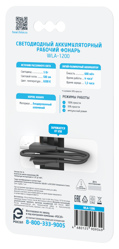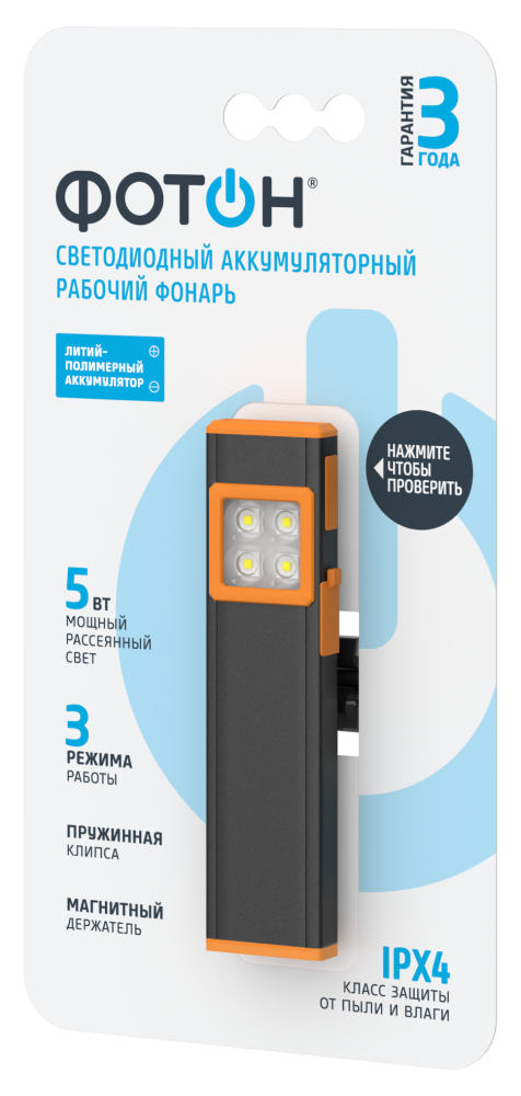| Особенности | Магнитный держатель на торце и металлическая клипса на задней стороне фонаря |